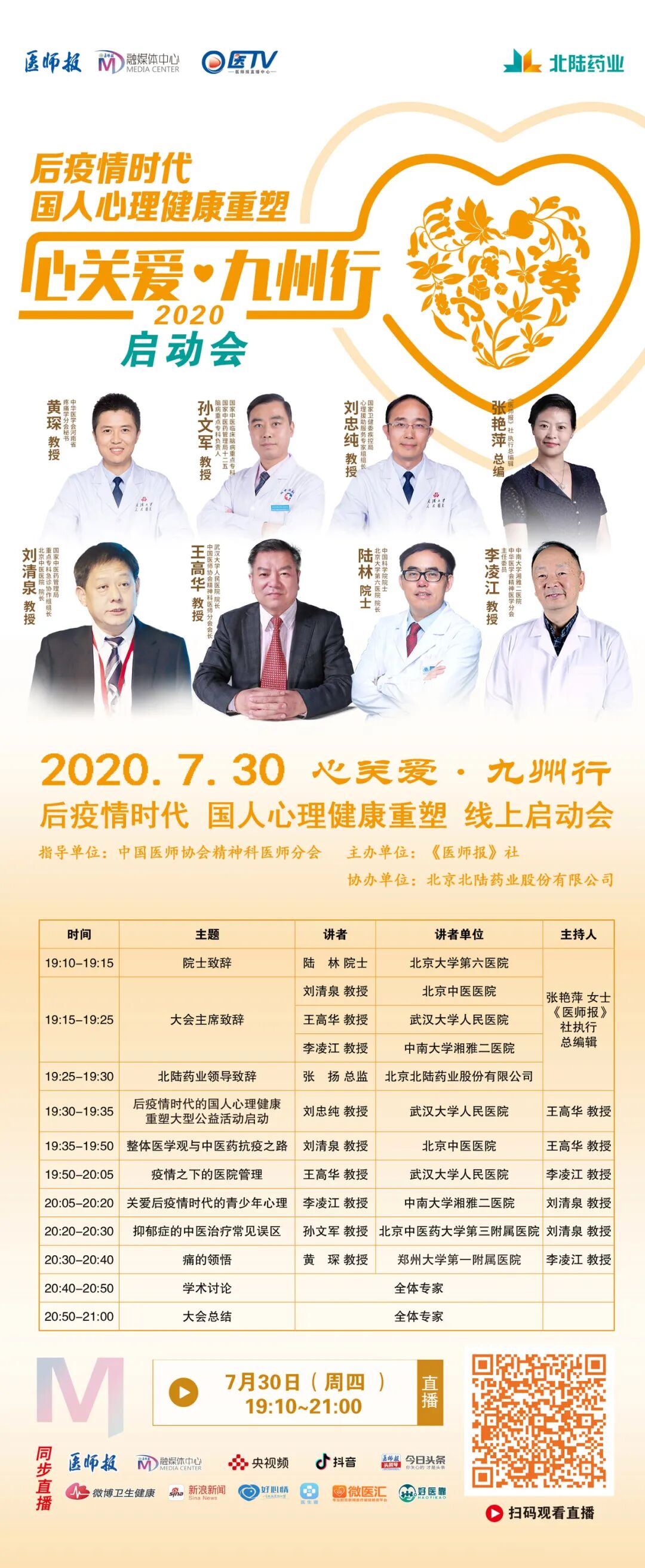 7月30日,“心關(guān)愛·九州行”公益心理健康援助項(xiàng)目云啟動(dòng)儀式圓滿結(jié)束。本次活動(dòng)以“后疫情時(shí)代國人心理健康重塑”為主題,由中國醫(yī)師協(xié)會(huì)精神科醫(yī)師分會(huì)指導(dǎo),《醫(yī)師報(bào)》社主辦,北陸藥業(yè)協(xié)辦,醫(yī)TV等六大直播平臺(tái)同步直播。