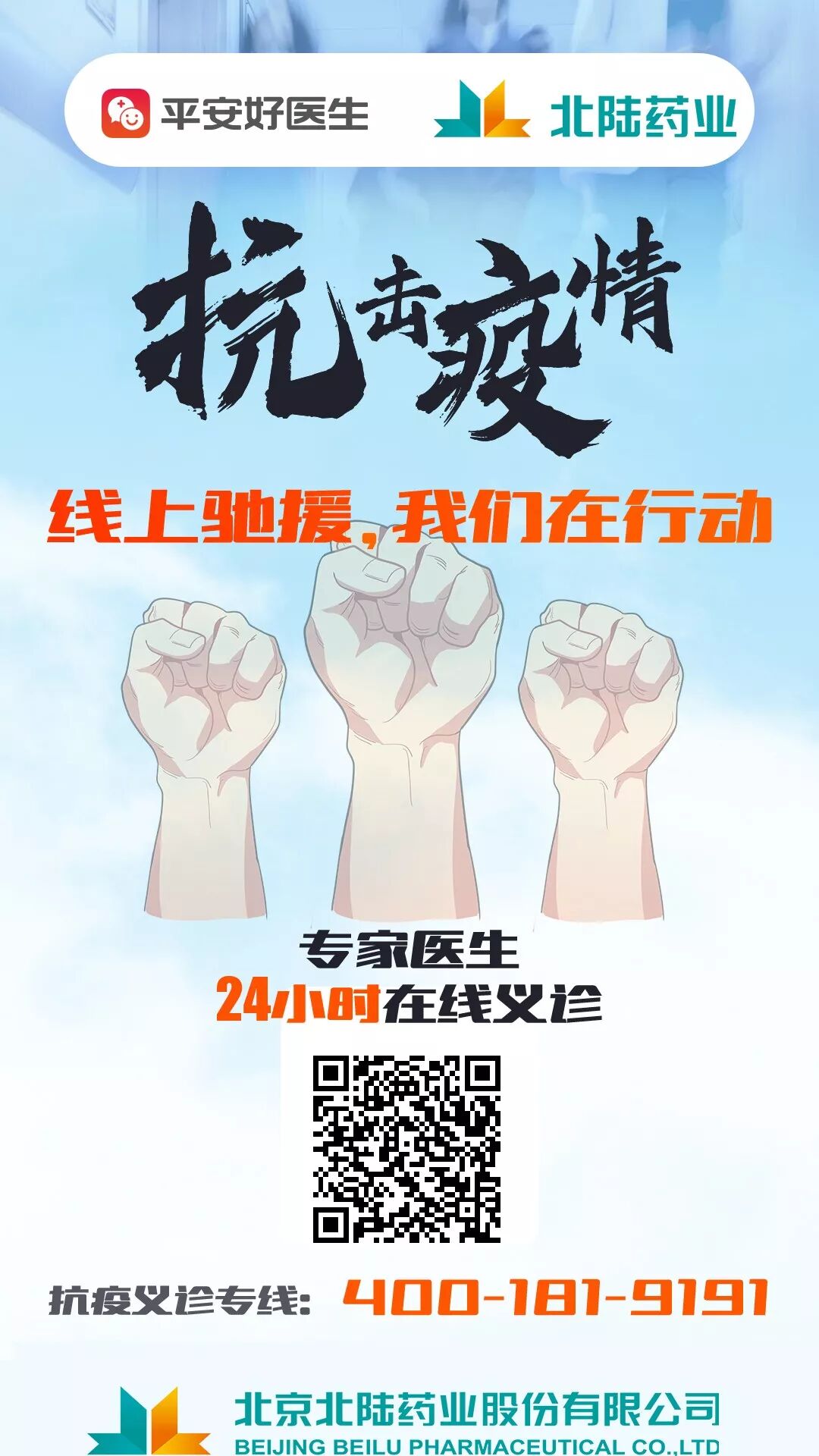 正如公司董事長兼總經(jīng)理王旭先生所說:“我們要做最壞的打算,但是我們要做最好的努力!”一方面北陸會繼續(xù)盡自己的努力籌措物資支援我們一線的白衣天使,另一方面,作為一家上市的醫(yī)藥企業(yè),北陸也將做好自己的本職工作。目前公司在相關(guān)政府的指導(dǎo)下,在做好疫情防控的大前提下,生產(chǎn)研發(fā)已經(jīng)開始部分復(fù)工,職能部門同事已開始遠(yuǎn)程辦公,銷售同事們也都已經(jīng)各司其職。考慮到患者在目前的情況下可能去醫(yī)院問診或開具相關(guān)藥品不方便,公司還聯(lián)手平安好醫(yī)生共同推出了24小時免費義診專線,以及緩解焦慮情緒的心理義診專線,以服務(wù)廣大患者。(點擊下方圖片二維碼即可進(jìn)入義診頁面)![]()